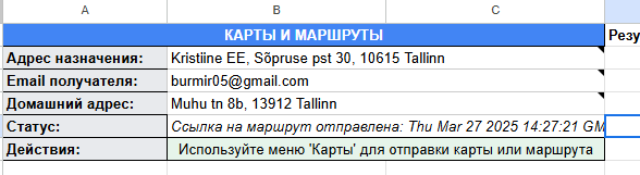 sheet.getRange("B6").setValue("Используйте меню 'Карты' для отправки карты или маршрута");