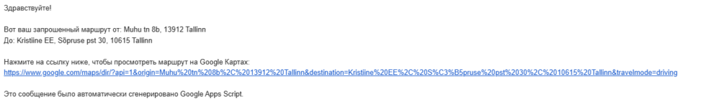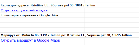 sheet.getRange('A15').setFormula('=HYPERLINK("' + routeUrl + '"; "Открыть маршрут в Google Maps")');