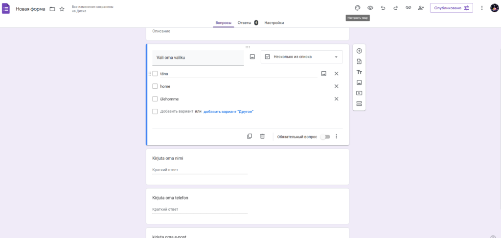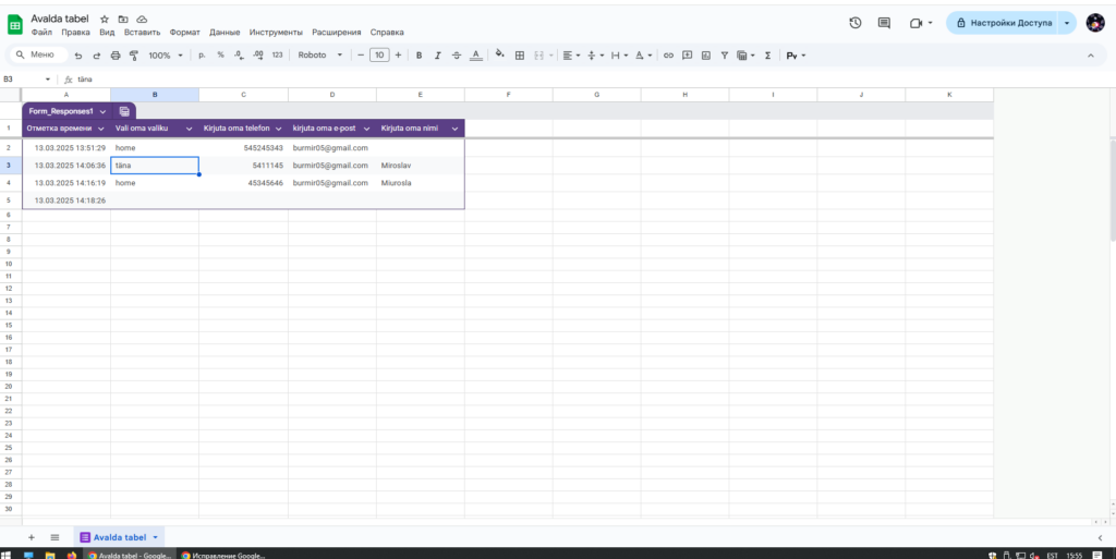 // Лист текущей таблицы с именем "Avalda tabel", в который загружаются ответы из формы