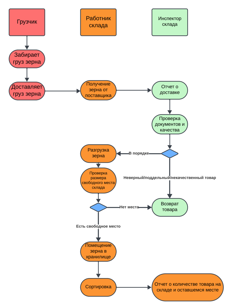 На данной схеме показан процесс обработки поставки зерна на склад, включая транспортировку, проверку качества, размещение и отчетность. Отражены роли сотрудников: грузчика, складского работника и инспектора. Схема также учитывает возможные решения, например, проверку соответствия качества и наличие свободного места.